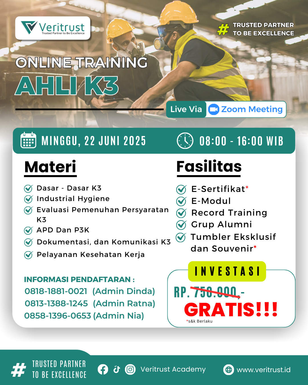 Posted on NAGA Ber42025-07-28Trustindex verifies that the original source of the review is Google. Terimakasih veritrus dan team nya telah memberikan saya pengalaman dan pengerahuan , para admin yang baik dan ramah para trainer yang sangat berkopenten semoga materi materi yang telah saya pelajari bisa jadi ilmu yang bermanfaatPosted on Budi Heryanto2025-07-27Trustindex verifies that the original source of the review is Google. Terimakasih atas pengetahuannya,.. Sukses slalu PT veritrust Terimakasih banyak.Posted on PT. KSU INTI PRIMA2025-07-21Trustindex verifies that the original source of the review is Google. Hari ini saya berkesempatan ikut pelatihan Awareness Ahli K3 yang diselenggarakan oleh Veritrust Academy. Satu kata: mencerahkan. Pelatihan ini benar-benar ngebuka wawasan saya tentang pentingnya penerapan Keselamatan dan Kesehatan Kerja (K3)Posted on Fatih Tazki2025-07-21Trustindex verifies that the original source of the review is Google. tempat pelatihan yang bagus dan menyenangkanPosted on Daffa Raynandra Anindito2025-07-20Trustindex verifies that the original source of the review is Google. menjadi tempat pelatihan K3 yang keren dan dapat meningkatkan kompetensiPosted on Meyta Threeasmawantie2025-07-20Trustindex verifies that the original source of the review is Google. Sangat seru dan berkualitasPosted on Ridho Putra2025-07-20Trustindex verifies that the original source of the review is Google. Terimakasih atas pengalaman dan pelatihan yang diberikan🙏🏻